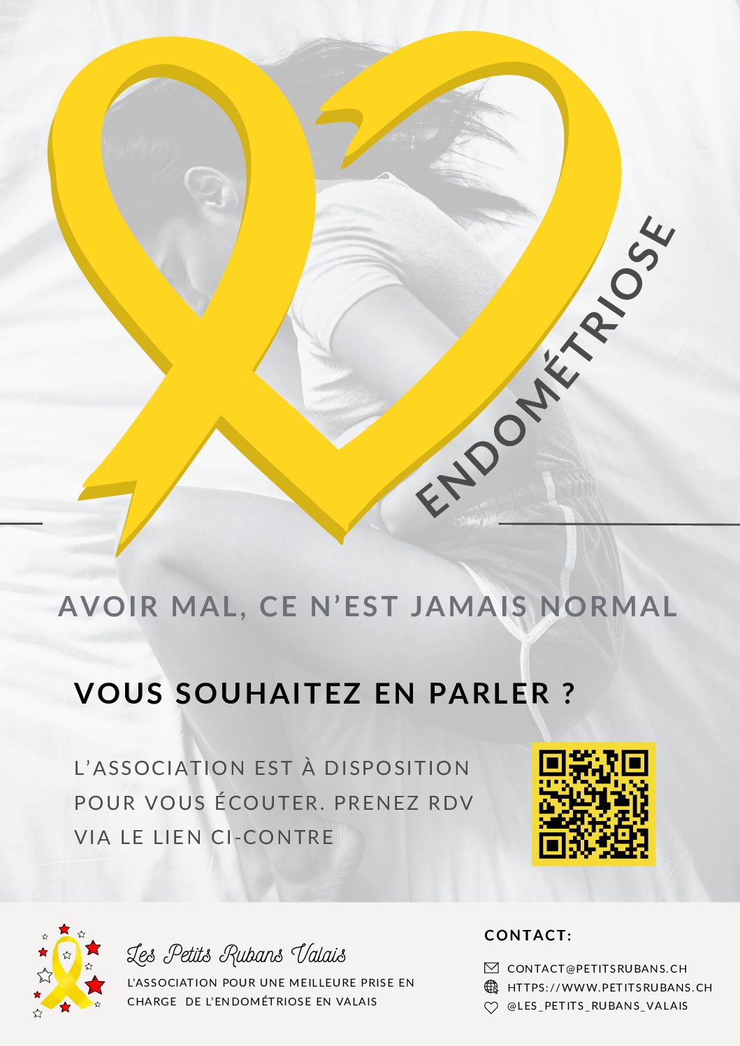 Tout au long du mois de mars, notre matériel sera distribué auprès des pharmacies, commerces et praticien·nes du Valais romand afin d’informer, faire connaître la maladie et encourager une meilleure reconnaissance.